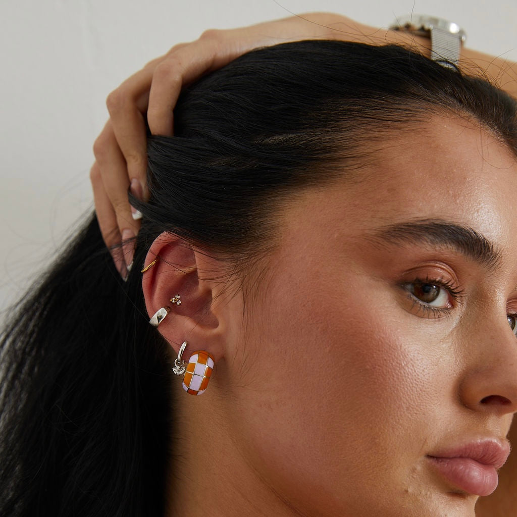 Sleek, subtly textured and crafted from sterling silver, this pair are all about making a subtle statement whilst gently hugging your lobe. Style up with a minimal hoop or stud to ramp up your ear party.