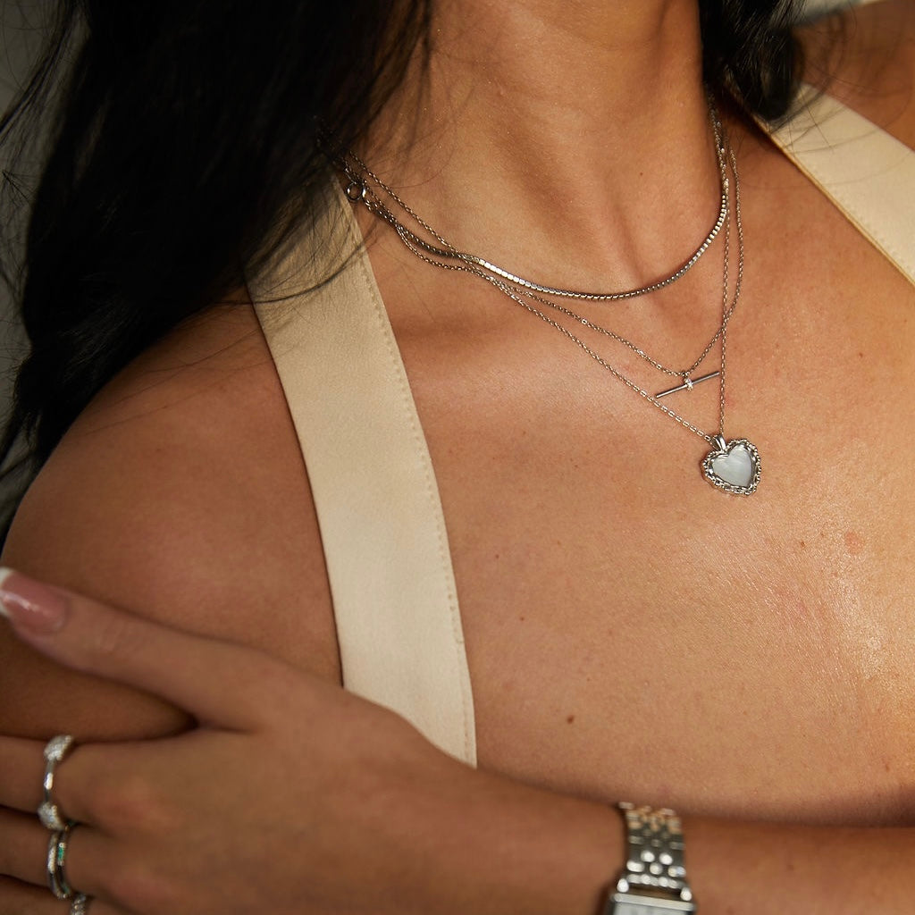 Share the love with the dreamy Eloise necklace which features a heart-shaped pendant and a central mother of pearl with a signature ridged edge, paired with a delicate chain. Wear solo or layer up to make a statement.