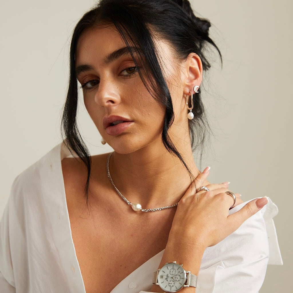 Sterling Silver: We use certified 925 sterling silver which is 92.5% pure silver mixed with alloys to create a long-lasting precious metal. We coat the jewellery with a generous layer of rhodium plating to ensure shine and durability from everyday wear. You can use the polishing cloth provided to keep your jewellery looking shiny. All sterling silver items are stamped with the '925' mark indicating the purity of the metal.